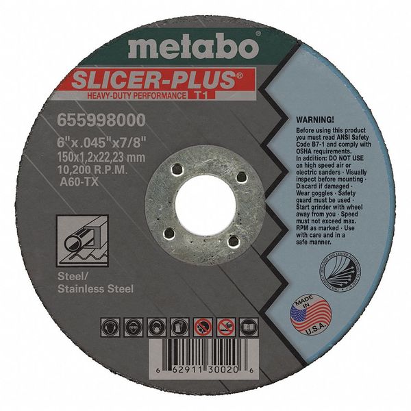 SKU G9078596Categories Abrasives & PolishersDescription Abrasive Cut-Off Wheel, Abrasive Material Aluminum Oxide, Grit 60, Connector Size 7/8 in, Connector Type Unthreaded Hole, Overall Diameter 6 in, Overall Thickness 0.045 in, Compatible Tool Type Angle Grinder, Primary Material Applicationn Stainless Steel, Steel, Series A60TX, Wheel Type Type 1, Maximum Operating Speed 10,200 RPMgraingerSKU: null, mscSKU: null, zoro_no: G9078596, mongo_id: 65bbe6f23aaddbd5a9064ec6
