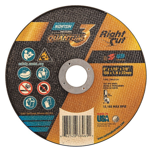 $10.99 / eachWeb priceAbrasive Cut-Off Wheel, 6" dia., 36 GritSKU G8656320Categories Abrasives & PolishersDescription Depressed Center Cut-Off Wheel, Abrasive Material Ceramic, Connector Size 7/8 in, Connector Type Unthreaded Hole, Grit 36, Overall Diameter 6 in, Overall Thickness 0.0625 in, Primary Material Applicationn Steel, Compatible Tool Type Angle Grinder, Series Quantum 3 RightCut, Wheel Type Type 27, Maximum Operating Speed 10,185 RPMgraingerSKU: null, mscSKU: null, zoro_no: G8656320, mongo_id: 65bbe6263aaddbd5a900efda