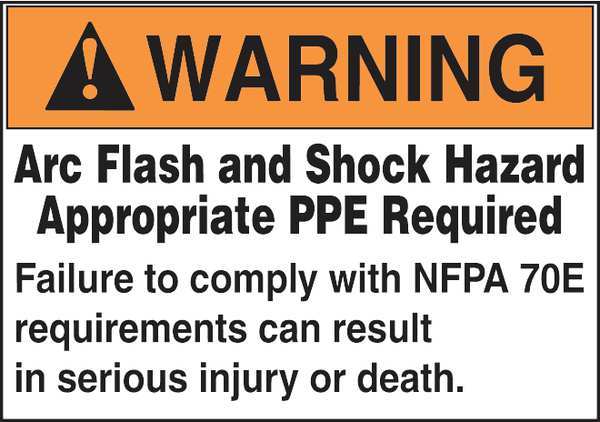 SKU G6134703Categories Adhesives, Epoxy & SealantsDescription Label, Horizontal Rectangle, Number of Printed Sides 1, English, Sign Format ANSI/OSHA Format, Sign Legend Arc Flash And Shock Hazard Appropriate Ppe Required Failure To Comply With Nfpa 70E Requirements Can Result In Serious Injury Or Death, Sign Legend Background Color White, Sign Legend Style Text, Package Quantity 100graingerSKU: , mscSKU: , zoro_no: G6134703, mongo_id: 65bbe6103aaddbd5a9004a39