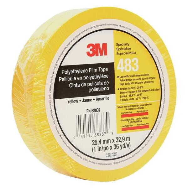 $51.61 / eachWeb priceFilm Tape, Polyethylene, Yellow, 1In x 36YdSKU G4630254Categories Adhesives, Epoxy & SealantsDescription Adhesion to Steel 12 oz/in, Tape Brand 3M(TM), Common Industry Automotive, General Maintenance & Repair, Indoor and Outdoor, Imperial Tape Length 36 yd, Imperial Tape WxL 1 in x 36 yd, Maximum Tape Performance Temperature 170 Degrees F, Minimum Tape Performance Temperature -20 Degrees F, Tape Adhesive Format Single-Sided, Continuous Roll, Series 483, Tape Adhesive Material Rubber, Tape Backing Material Polyethylene Film, Tape Sub-Type Water-Tight Sealing Film Tape, Tape Thickness 5.3 milgraingerSKU: 24A718, mscSKU: , zoro_no: G4630254, mongo_id: 65bbe85f9a749db82278a53b