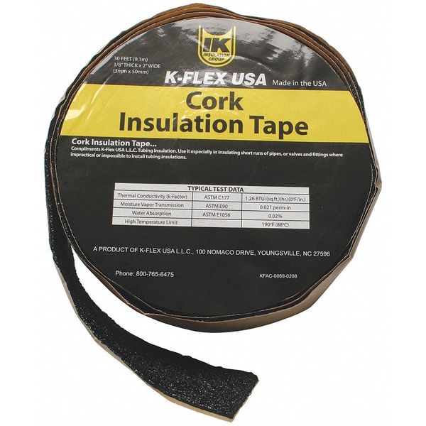 Pipe Insulation Tape, 30 ft Overall Lg, 2 in Overall Wd, 130 mil Thick, Cork, BlackSKU G3112901Categories Adhesives, Epoxy & Sealants , Raw MaterialsDescription Pipe Insulation Tape, Backing Material Cork, Overall Length 30 ft, Overall Width 2 in, Thickness 130 mil, Color Black, Minimum Operating Temperature -20 Degrees F, Maximum Operating Temperature 190 Degrees F, Standards ASTM C177, ASTM C771, ASTM C987, ASTM D1056, ASTM D71, ASTM E96, Adhesive Material Rubber, For Location Indoor, For Use On Short Pipe Runs, Resistance Properties Ozone-Resistant, Elongation 50 Percent, For Environment Non-Dusting, For Piping System Air Conditioning, RefrigerationgraingerSKU: 45AT32, mscSKU: , zoro_no: G3112901, mongo_id: 65bbe5d03aaddbd5a9fea1f5