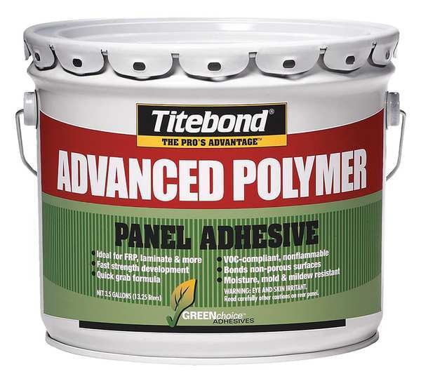 Panel Adhesive, GREENchoice Advanced Polymer Series, Tan, 3.5 gal, PailSKU G3321145Categories Adhesives, Epoxy & SealantsDescription Construction Adhesive, Adhesive Color White, Application Method V-Notch Trowel, Chemical Base Polyether, Container Size 3.5 gal, Container Type Pail, Features Mildew Resistant, Moisture Resistant, Mold Resistant, Gap Fill 0.125 in, Interior/Exterior Interior/Exterior, Working Time 20 min, VOC Content Weight Percentage 3.42 Percent, Water Resistance Water-Resistant, VOC Content Weight Less Than 50 g/L, Standards ASTM C557, ASTM E84, CARB Compliant, LEED Compliant, NAHB, SCAQMD, VOC Compliant$239.99 / eachWeb price -