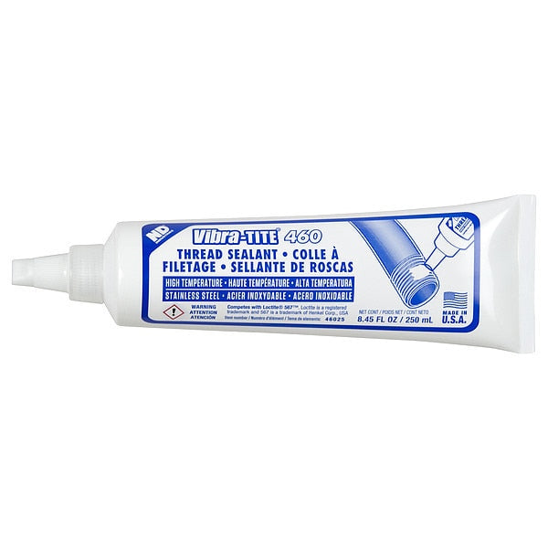 Thread Sealant, White, Tube, 250mLSKU G6280316Categories Adhesives, Epoxy & SealantsDescription Pipe Thread Sealant, Cure Type Anaerobic, Series 460, Container Size 8.5 fl oz, Container Type Tube, Maximum Operating Temperature 400 Degrees F, Minimum Operating Temperature -65 Degrees F, Maximum Operating Pressure for Gases 300 psi, Maximum Operating Pressure for Liquids 10,000 psi, Color White, For Fluid Type Gases, Oil, Water, For Material Type Metal, Specific Sealing Application For Stainless Steel Thread Sealing, Standards GM-1182607, For Maximum Thread Diameter 2 ingraingerSKU: 49CH29, mscSKU: , zoro_no: G6280316, mongo_id: 65bbe7d63aaddbd5a90bc40e
