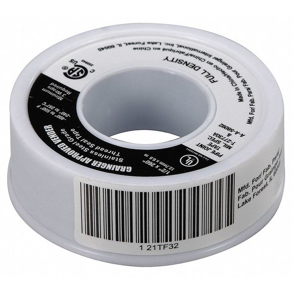Thread Sealant Tape, 1/2 In. W, 260 In. LSKU G1279625Categories Adhesives, Epoxy & SealantsDescription Thread Sealant Tape, Specific Sealing Application General Purpose Thread Sealing, Series POLY-TEMP(R) XHD, Overall Width 1/2 in, Overall Length 21 ft, Minimum Operating Temperature -400 Degrees F, Maximum Operating Temperature 550 Degrees F, Maximum Operating Pressure for Liquids 10,000 psi, Maximum Operating Pressure for Gases 2,000 psi, Maximum Linear Density 1.5 g/cc, Minimum Linear Density 1.2 g/cc, Color White, Tape Type Pipe Thread Sealant Tape, For Maximum Thread Diameter 1 1/2 ingraingerSKU: 3PDK9, mscSKU: , zoro_no: G1279625, mongo_id: 65bbe7643aaddbd5a90911d0