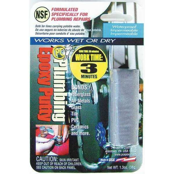 PC-Plumbing Epoxy Putty, 1.3 oz. 3 min work time, 1 hr cureSKU G0694741Categories Adhesives, Epoxy & SealantsDescription Putty, Container Type Stick, Application Plumbing Repair, Base Material Epoxy, Color Gray/Tan, Container Size 1.3 oz, Full Cure Time 4 hr, Maximum Performance Temperature 250 Degrees F, Minimum Performance Temperature 35 Degrees F, Working Time 15 min, For Use On Surface Material Ceramic, Fiberglass, Glass, Metal, PVC, Standards 29 CFR 1910.1200, Flash Point Greater than 199.9 Degrees F, Patching and Repairing Properties Quick Drying, Product Form Putty, Product Type Putty$5.36 / eachWeb price -