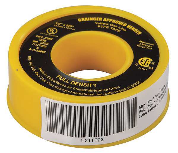 Sealant Tape, 1/2 x 520 InSKU G1818358Categories Adhesives, Epoxy & SealantsDescription Thread Sealant Tape, Specific Sealing Application For Gas, Overall Width 1/2 in, Overall Length 43 ft, Minimum Operating Temperature -400 Degrees F, Maximum Operating Temperature 550 Degrees F, Maximum Operating Pressure for Liquids 10,000 psi, Maximum Operating Pressure for Gases 2,000 psi, Maximum Linear Density 1.5 g/cc, Minimum Linear Density 1.2 g/cc, Color Yellow, Tape Type Pipe Thread Sealant Tape, For Maximum Thread Diameter 3/4 in, For Material Type Brass, Steel, For Fluid Type Gases$5.35 / eachWeb price -