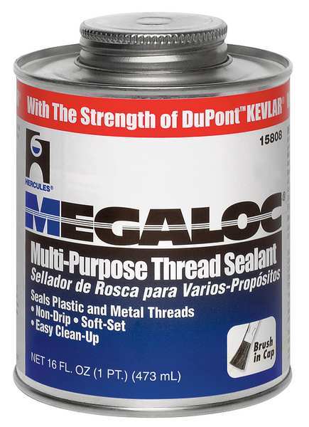 Thread Sealant, 16 fl. oz., WhiteSKU G7630463Categories Adhesives, Epoxy & SealantsDescription Pipe Thread Sealant, Cure Type Non-Hardening, Series Megaloc, Container Size 19.2 fl oz, Container Type Brush-Top Can, Maximum Operating Temperature 400 Degrees F, Minimum Operating Temperature -50 Degrees F, Maximum Operating Pressure for Gases 2,600 psi, Maximum Operating Pressure for Liquids 12,000 psi, Color Blue, For Fluid Type Air, Butane, Diesel Fuel Oil, Fuels, Kerosene, Petroleum, Natural Gas, Potable Water, Propane, Steam, WatergraingerSKU: 20CM15, mscSKU: , zoro_no: G7630463, mongo_id: 65bbe9f322d7a989a9989629