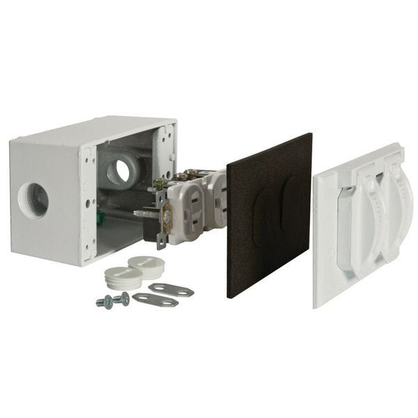 Description While In Use Weatherproof Cover, Body Material Die-Cast Metal, Mounting Orientation Horizontal, Receptacle Type and Rounds, Duplex, GFCI, Switch, Depth 3 1/2 in, Number of Gangs 1, Width 5 1/8 in, Height 4 3/8 in, Features 8-In-1 Configuration, Metallic, Gasket Material Polyethylene Foam, Color Gray, Standards UL, Includes Attached Gasket and Mounting Hardware
