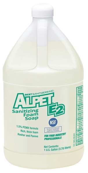 Description Hand Soap, Color Clear, Form Foam, Product Type Hand Soap, Series Alpet E2, Container Size 1 gal, Container Type Jug, Fragrance Fragrance Free, Hygiene Properties Sanitizing, Formula 1.5 Percent PCMX, Includes Grit No, Number of Pumps Included Not Applicable, Manufacturer Dispenser Part Number MD10003, MD10110, MD10201, Requires Dispenser Yes, Includes Not Applicable, Standards Not Applicable, NSF Rating E2, Removes Germs
