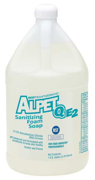 Description Hand Soap, Color Clear, Form Foam, Product Type Hand Soap, Series Alpet Q E2, Container Size 1 gal, Container Type Jug, Fragrance Fragrance Free, Hygiene Properties Sanitizing, Formula 0.12 Percent Benzalkonium Chloride, Includes Grit No, Number of Pumps Included Not Applicable, Manufacturer Dispenser Part Number MD10003, MD10110, MD10201, Requires Dispenser Yes, Includes Not Applicable, Standards Not Applicable, Application Hand Cleansing, NSF Rating E2, Removes Germs