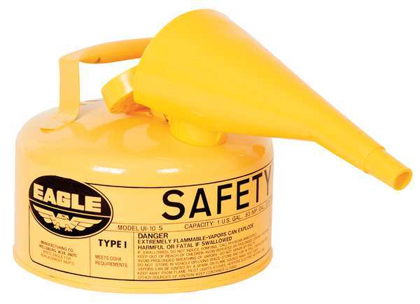 SKU G4828214CategoriesDescription Type I Safety Can, Can Type Type I, DOT Approved No, Capacity 1 gal, Compatible Fluids Diesel, Color Yellow, Can Material Steel, Material Finish Powder Coated, Hose Outside Diameter Not Applicable, Included Hose/Funnel Funnel, Can Diameter 9 in, Overall Height 8 in, Includes Faucet No, Faucet Channel Diameter Not Applicable, Overall Width Not Applicable, Cap Features Self-Closing, Footprint Shape Circle, Includes F 15 Funnel, Includes Flame Arrester Yes, Overall Length Not ApplicablegraingerSKU: 3NKP9, mscSKU: , zoro_no: G4828214, mongo_id: 65bbea3422d7a989a999fba5