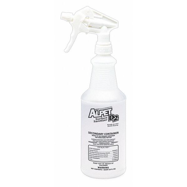 Description Trigger Spray Bottle, Dispensing Type Stream, 32 oz, Clear, Sprayer Color White, Bottle Material Plastic, Sprayer Material Plastic, Dip Tube Length 9 1/2 in, Imprinting Alpet D2 Surface Sanitizer, Graduation Markings No, Overall Height 10 in, Closure Size 28/400, Compatible Grainger Part Number 36P184, 36P185, Compatible Mfg. Model Number SS10002; SS10001, (12) Trigger Sprayers, Standards EPA Registered, Halal, Kosher, NSF Rated, Pareve, Closure Diamenter 28 mm, Closure Thread Style 400