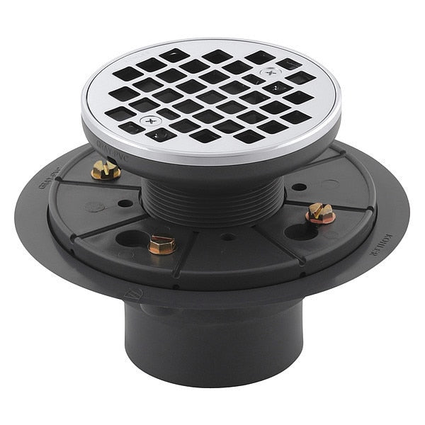 Description Shower Drain, Standards ASME A112.18.2, CSA B125.2, Includes Grate Yes, Pipe Outside Diameter 2 3/8 in, Drain Material Brass, Plastic, Connection Type Threaded, Ligature Resistant No, Body Height 4 1/4 in, Product Type Shower Drain, Drain Style Round, Grate Material Brass, Overall Diameter 6 1/2 in, Body Diameter 6 1/2 in, Overall Height 4 1/4 in