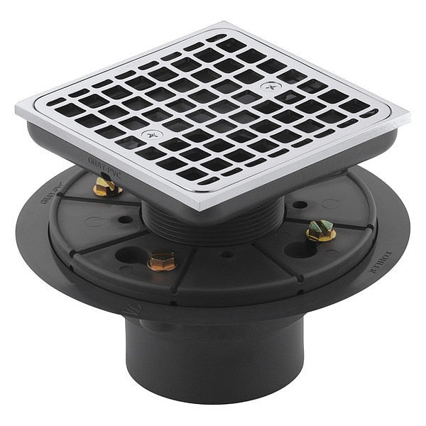 Description Shower Drain, Standards ASME A112.18.2, CSA B125.2, Includes Grate Yes, Pipe Outside Diameter 2 3/8 in, Drain Material Brass, Plastic, Connection Type Threaded, Ligature Resistant No, Body Height 4 1/8 in, Product Type Shower Drain, Drain Style Square, Grate Material Brass, Overall Width 6 1/2 in, Overall Length 4 1/8 in, Body Diameter 6 1/2 in, Overall Height 4 1/8 in