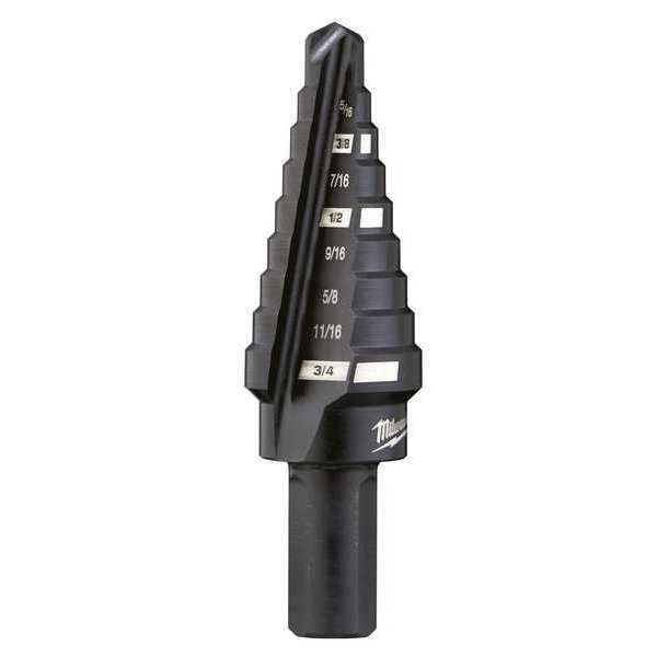 Description Step Drill Bit, High Speed Steel, Black Oxide, 1/4 in to 3/4 in Size Range, Straight with Three Flats, 3/8 in Shank Diameter, 2 9/16 in Overall Length