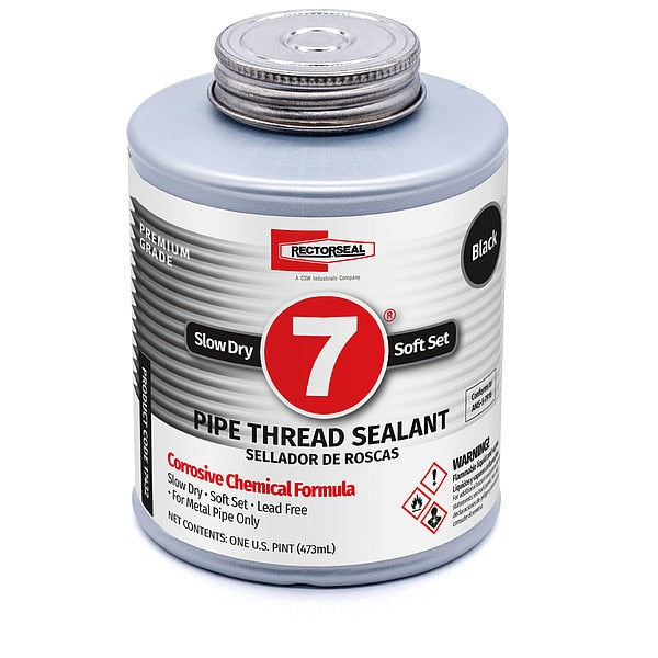 #7 Pipe Thread Sealant, 1 pt., BlackSKU G5069057Categories Adhesives, Epoxy & SealantsDescription Pipe Thread Sealant, Cure Type Non-Hardening, Series No. 7, Container Size 16 fl oz, Container Type Brush-Top Can, Maximum Operating Temperature 450 Degrees F, Minimum Operating Temperature -50 Degrees F, Maximum Operating Pressure for Gases Not Rated, Maximum Operating Pressure for Liquids Not Rated, Color Black, For Fluid Type Air, Alcohol, Fuels, For Material Type Aluminum, Brass, Copper, Galvanized Steel, Iron, Metal, Stainless SteelgraingerSKU: 46F524, mscSKU: , zoro_no: G5069057, mongo_id: 65bbedfe526e052139ae2322