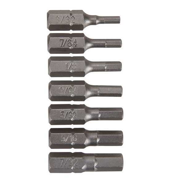 SKU G403541510Categories Hand ToolsDescription Screwdriver Bit Set, No. of Pieces 7, Hex Shank Size 1/4 in, Fastening Tool Material S2 Steel, Impact Rated Yes, Impact, Includes 1/8 in Bit, 3/16 in Bit, 3/32 in Bit, 5/32 in Bit, 7/32 in Bit, 7/64 in Bit, 9/64 in Bit, Bit Length 1 1/4 ingraingerSKU: 787P71, mscSKU: , zoro_no: G403541510, mongo_id: 65bbe7d53aaddbd5a90bbe4e