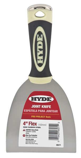 $12.11 / eachWeb priceJoint Knife, Flexible, 4", Carbon SteelSKU G4545432Categories Hand Tools , Raw MaterialsDescription Drywall and Putty Knives, Nonsparking No, Flexible, Blade Type Standard, Blade Width 4 in, Blade Material Carbon Steel, Handle Material Polypropylene/TPE, Joint Knife, Blade Length 4 in, Handle Length 4 1/2 in, Handle Design Hammer Head, Soft Grip, No. of Edges 1, Color Black/Cream, Overall Length 8 ingraingerSKU: 24Z416, mscSKU: 68919273, zoro_no: G4545432, mongo_id: 65bbe7623aaddbd5a90903da