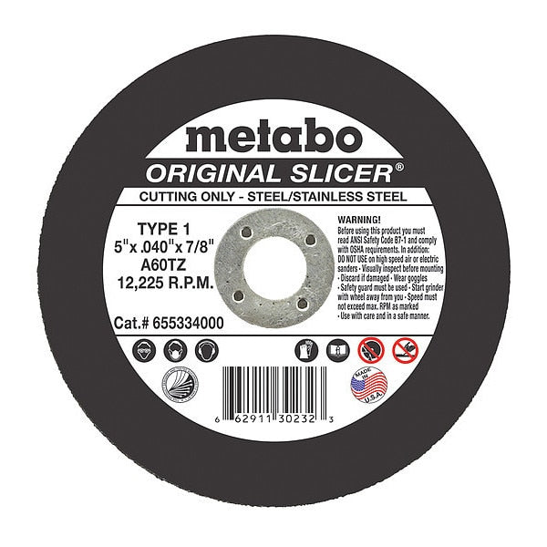 SKU G4562717Categories Hand ToolsDescription Abrasive Cut-Off Wheel, Abrasive Material Aluminum Oxide, Grit 60, Connector Size 7/8 in, Connector Type Unthreaded Hole, Overall Diameter 5 in, Overall Thickness 0.04 in, Compatible Tool Type Angle Grinder, Primary Material Applicationn Stainless Steel, Steel, Series A60TZ, Wheel Type Type 1, Maximum Operating Speed 12,225 RPMgraingerSKU: 32PJ20, mscSKU: , zoro_no: G4562717, mongo_id: 65bbe7393aaddbd5a90819bd