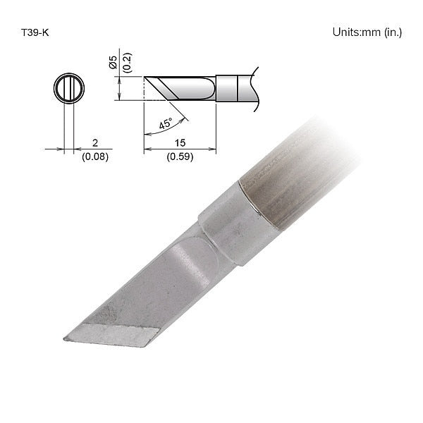SKU G809899048Categories Hand ToolsDescription TIP,KNIFE,5MM/45DEG X 15MM,RT EDGE,FX-9701/9702, Tip Series T39, Tip Type Knife, Tip Length 0.59 in, Compatible Handpiece Manufacturer Model Number FX-9701, FX-9702, Tip Outside Diameter 0.2 in, Tip Thickness 0.08 in, Tip Angle 45 Degrees , Compatible Station FX-971, Compatible Handpiece Manufacturer Hakko, Material Composite, Overall Length 4 1/4 in, Product Type Soldering Tip$36.99 / eachWeb price