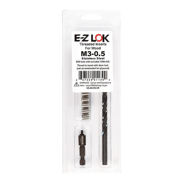 SKU G409228378Categories Hand ToolsDescription Knife Thread Insert, System of Measurement Metric, Insert Diameter 6.35 mm, Overall Length 9.525 mm, Internal Thread Size M3-0.50, Thread Direction Right Hand, Thread Type Coarse, Material Stainless Steel, Material Grade/Class 18-8, Finish Plain, Drive Type Slotted, Drill Bit Size 17/64 in, Compatible Material Wood, Minimum Material Thickness 10 9/64 mm, Maximum Hole Diameter 6.756 mm, Compatible with Manufacturer Model Number 500-006, Includes (10) Threaded Inserts, Drill, Drive Tool$29.01 / eachWeb price