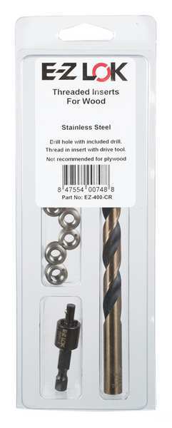 SKU G3317310Categories Hand ToolsDescription Thread Insert Kit, Number of Inserts 10, Number of Pieces 12, Insert Diameter 21/64 in, Insert Length 3/8 in, Internal Thread Size #8-32, Thread Direction Right Hand, Thread Type Coarse, Insert Material Stainless Steel, Finish Plain, Material Grade/Class 18-8, Drive Type Slotted, Compatible Material Wood, Drill Bit Sizes Included 17/64 in, Minimum Material Thickness 3/4 in, Maximum Hole Diameter 0.266 in, System of Measurement Inch, Manufacturer Location Made in USAgraingerSKU: 45JZ80, mscSKU: , zoro_no: G3317310, mongo_id: 65bbe94a22d7a989a9947a4d
