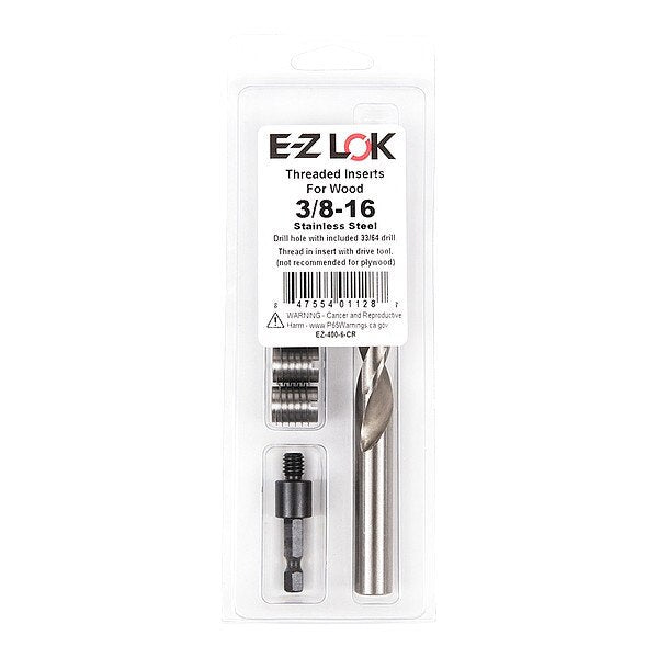 SKU G009228341Categories Hand ToolsDescription Knife Thread Insert, System of Measurement Inch, Insert Diameter 1/2 in, Overall Length 5/8 in, Internal Thread Size 3/8 In.-16, Thread Direction Right Hand, Thread Type Coarse, Material Stainless Steel, Material Grade/Class 18-8, Finish Plain, Drive Type Slotted, Drill Bit Size 33/64 in, Compatible Material Wood, Minimum Material Thickness 25/32 in, Maximum Hole Diameter 0.516 in, Compatible with Manufacturer Model Number DT-6, Includes (5) Threaded Inserts, Drill, Drive Tool$52.71 / eachWeb price