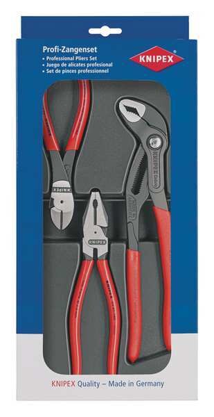 SKU G1679380Categories Hand ToolsDescription Plier Set, ESD-Safe No, Insulated No, Number of Pliers 3, Plier Types Diagonal, Water Pump, Pliers Included 10 in Water Pump Pliers, 6 1/4 in High Leverage Diagonal Cutter, 7 1/4 in High Leverage Combination Pliers, Jaw Opening Type Manual, Voltage Rating None, Grip Style Knurled, Additional Tool Functions Cable Cutter, Wire Cutter, Container Type Plastic Part, Cutting Capacities 1 13/16 in (Nut), 1 31/32 in (Pipe), 3/32 in (Hard Wire), 5/64 in (Piano Wire), Features Euro Standard PerforationgraingerSKU: 38UT25, mscSKU: , zoro_no: G1679380, mongo_id: 65bbe94522d7a989a99446bc