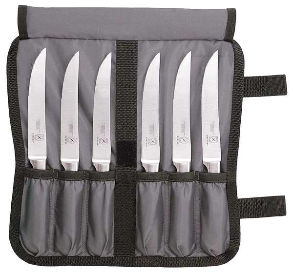 Steak Knife Set, 7 PieceSKU G2920163Categories Hand ToolsDescription Knife Set, FDA Compliant No, Forged/Stamped Forged, Knife Type Knife Set, Blade Material Steel, Dishwasher Safe No, Handle Color Black, Blade Type Serrated, Includes Storage Roll, NSF Certified Yes, Handle Material Santoprene, Blade Length 5 in, Metal Detectable No, Number of Implements 6graingerSKU: , mscSKU: , zoro_no: G2920163, mongo_id: 65bbe7183aaddbd5a9074eeb