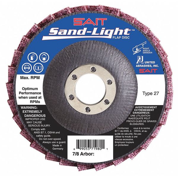 SAIT 71980 Sand-Light⢠Flap Discs, 4-1/2" x 7/8", Coarse (Brown) , 5-PackSKU G5165246Categories Lighting ToolsDescription Flap Disc, Abrasive Type Non-Woven, Abrasive Material Silicon Carbide, Grade Coarse, Connector Size 7/8 in, Connector Type Unthreaded Hole, Flap Disc Type Type 27, Overall Diameter 4 1/2 in, Series Sand-Light, Backing Material Fiberglass, Grit 40, Maximum Operating Speed 13,300 RPM, Color Brown$20.94 / eachWeb price -