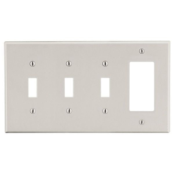 Wallplate, 4-Gang, 3) Toggle 1) Decorator, Light AlmondSKU G400490705Categories Lighting ToolsDescription Rocker/Toggle Wall Plate, Color Light Almond, Material Polycarbonate, Number of Gangs 4, Plate Size Standard, Resistance Properties Impact Resistant, Combination Type Decorator-Rocker/Toggle, Finish Satin, For Switch Type Rocker, Toggle, Number of Outlet Openings 0, Number of Switch Openings 4, Outlet Orientation Vertical, Overall Height 0.3 in, Overall Width 8.3 in, Standards cULus Listed, UL 94 Flammability Rating V-2, Wall Plate Type Toggle, For Use With ReceptaclegraingerSKU: 784FG0, mscSKU: , zoro_no: G400490705, mongo_id: 65bbe7a63aaddbd5a90a9de5