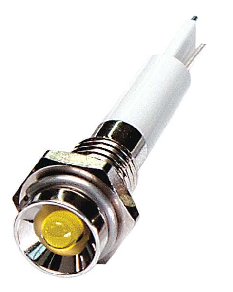 SKU G4668377Categories Lighting ToolsDescription Protruding Indicator Light, LED, Brass Plated Chrome, LED, Plastic (ABS), Yellow, Voltage 12V DC, Size 6mm Mounting dia, Electrical Connection Lead for Soldering, Shape Round, Current Drawn 20 mA, Average Life 100,000 hr, IP Rating 40, Panel Thickness Up to 0.160 in, Standards ROHS$4.45 / eachWeb price