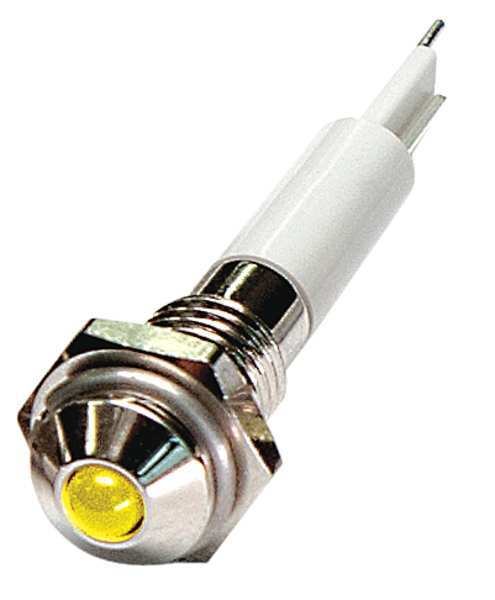 SKU G4672762Categories Lighting ToolsDescription Round Indicator Light, LED, Brass Plated Chrome, LED, Plastic (ABS), Yellow, Voltage 24V DC, Size 6mm Mounting dia, Electrical Connection Lead for Soldering, Shape Round, Current Drawn 20 mA, Average Life 100,000 hr, IP Rating 40, Panel Thickness Up to 0.160 in, Standards ROHS$4.45 / eachWeb price