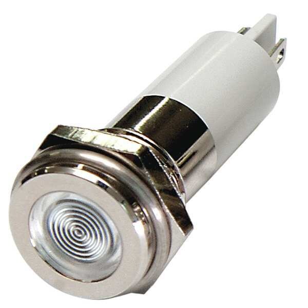 Flat Indicator Light, White, 24VDCSKU G4703632Categories Lighting ToolsDescription Flat Indicator Light, LED, Brass Plated Chrome, LED, Plastic (ABS), White, Voltage 24V DC, Size 8mm Mounting dia, Electrical Connection Male .110 Connector, Shape Round, Current Drawn 20 mA, Average Life 100,000 hr, IP Rating 40, Panel Thickness Up to 0.160 in, Standards ROHSgraingerSKU: , mscSKU: , zoro_no: G4703632, mongo_id: 65bbe89022d7a989a98ff1da