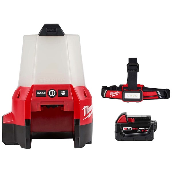 Work Light, Headlamp and Battery,SKU G108864372Categories Lighting ToolsDescription Work Light, Headlamp and Battery, Battery Platform M18, Series RADIUS(TM), Light Output Mode High / Medium / Low, Brightness Level 250 lm, 1,000 lm, 2,200 lm, Maximum Brightness Level 2,200 lm, Minimum Brightness Level 250 lm, Mount Type Floor Stand with Handle, Hook, Maximum Height 10 3/8 in, Minimum Height 10 3/8 in, Light Distribution 90 Degrees , 360 Degrees , Head Type Fixed, Maximum Head Rotation Angle 0 Degrees , Cordless Tool Kit Contents (1) Battery, (2) Bare ToolsgraingerSKU: , mscSKU: , zoro_no: G108864372, mongo_id: 65bbe84c22d7a989a98e9901