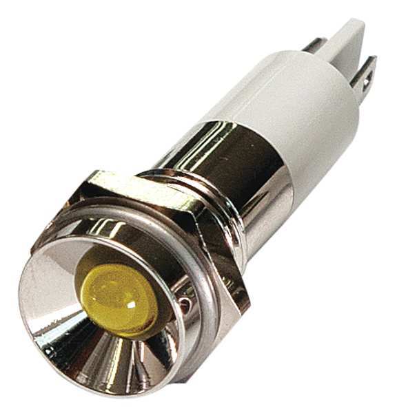 SKU G4697971Categories Lighting ToolsDescription Protruding Indicator Light, LED, Brass Plated Chrome, LED, Plastic (ABS), Yellow, Voltage 12V DC, Size 10mm Mounting dia, Electrical Connection Male .110 Connector, Shape Round, Current Drawn 20 mA, Average Life 100,000 hr, IP Rating 40, Panel Thickness Up to 0.160 in, Standards ROHSgraingerSKU: null, mscSKU: null, zoro_no: G4697971, mongo_id: 65bbe5f53aaddbd5a9ff8e4e