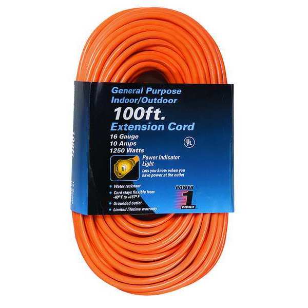 100 ft. 16/3 Lighted Extension Cord SJTWSKU G0533495Categories Lighting ToolsDescription Lighted Extension Cord, Location Outdoor, Cord Length 100 ft, Wire Size 16 AWG, Max. Amps 10 A, Voltage 125V AC, Plug Configuration NEMA 5-15P, Receptacle Configuration NEMA 5-15R, Cord Ending Single Connector, Number of Outlets 1, Jacket Color Orange, Jacket Material PVC, Trade Designation SJTW, Cord Shape Round, Temp. Rating -40 Degrees to 167 Degrees F, Number of Conductors 3, Power Indicator Yes, Plug Style Straight, Max. Watts 1,250 W, Nominal Outside Dia. 0.32 ingraingerSKU: 1FD54, mscSKU: , zoro_no: G0533495, mongo_id: 65bbe6073aaddbd5a9001f6d