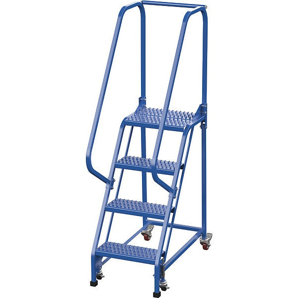 SKU G2125840Categories Material HandlingDescription Rolling Ladder, Material Steel, Platform Height 36 in, Handrails Included Yes, Handrail Height 30 in, Overall Height 66 in, Number of Steps 4, Unassembled, Load Capacity 450 lb, Step Tread Antislip Vinyl, Platform Depth 8 in, Platform Width 16 in, Bottom Width 25 in, Base Depth 34 in, Overall Width 25 in, Climbing Angle 59 Degrees , Step Depth 8 in, Step Width 16 in, Ladder Actuation Weight Activated Step Lock, Finish Powder Coated, Color Blue, Standards ANSI, OSHA, Includes Left HandrailgraingerSKU: 6LYE3, mscSKU: , zoro_no: G2125840, mongo_id: 65bbe82a22d7a989a98dd541