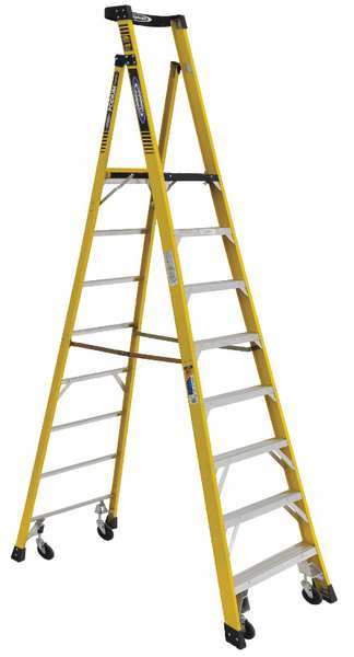 SKU G0330550Categories Material HandlingDescription Podium Stepladder, Ladder Height 11 ft, Platform Width 16 in, Platform Depth 19 1/2 in, Platform Height 8 ft, Load Capacity 375 lb, Bottom Width 34 1/2 in, Base Spread 68 in, Material Fiberglass, Series PD7300-4C, Number of Steps 8, Step Depth 3 in, Step Tread Ribbed, Rung/Step Spacing 12 in, ANSI Type IAA, Includes Factory Installed Spring Activated Casters, Large Standing Platform with Toe Guard, Waist High Guard Rail with Slots for Accessories, Standards ANSI, Net Weight 54 lbgraingerSKU: 45ED72, mscSKU: , zoro_no: G0330550, mongo_id: 65bbe82a22d7a989a98dd4f2