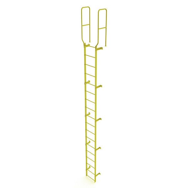 20 ft. 6" Ladder, Walk-Thru Fixed, Steel, 18-Rung, Steel, 18 Steps, Safety Yellow FinishSKU G2281811Categories Material HandlingDescription Fixed Ladder, Walk-Thru Included Yes, Exit Top, Overall Height 21 ft, Overall Width 28 in, Material Steel, Load Capacity 450 lb, Number of Steps 18, Top Step Height 17 ft, Rung Dia. 3/4 in, Rung/Step Spacing 12 in, Step Width 18 in, Finish Safety Yellow, Standards ANSI; OSHA Compliant, Includes 42 In. guardrails, Manufacturers Warranty Length 1 yrgraingerSKU: 231F11, mscSKU: , zoro_no: G2281811, mongo_id: 65bbe96322d7a989a994ff1a