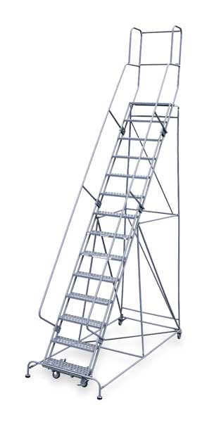 182 in H Steel Rolling Ladder, 14 StepsSKU G9931047Categories Material HandlingDescription Rolling Ladder, Material Steel, Platform Height 140 in, Handrails Included Yes, Handrail Height 42 in, Overall Height 182 in, Number of Steps 14, Unassembled, Load Capacity 450 lb, Step Tread Perforated, Platform Depth 30 in, Platform Width 24 in, Bottom Width 42 in, Base Depth 121 in, Overall Width 42 in, Climbing Angle 59 Degrees , Step Depth 7 in, Step Width 24 in, Ladder Actuation Foot Activated Step Lock, Finish Powder Coated, Color Gray, Standards ANSI, OSHA, Includes 2-1/2 in Rubber PadsgraingerSKU: 20Z239, mscSKU: , zoro_no: G9931047, mongo_id: 65bbe96322d7a989a994ff7b