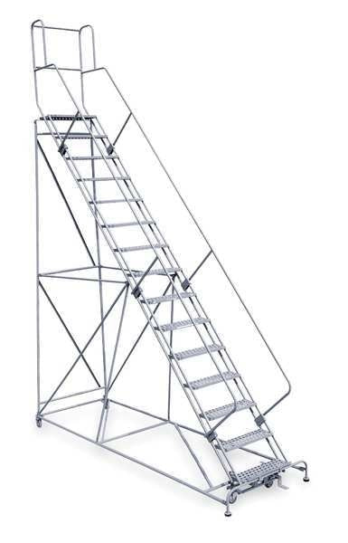192 in H Steel Rolling Ladder, 15 StepsSKU G9852577Categories Material HandlingDescription Rolling Ladder, Material Steel, Platform Height 150 in, Handrails Included Yes, Handrail Height 42 in, Overall Height 192 in, Number of Steps 15, Unassembled, Load Capacity 800 lb, Step Tread Antislip Vinyl, Platform Depth 12 in, Platform Width 24 in, Bottom Width 42 in, Base Depth 143 in, Overall Width 42 in, Climbing Angle 59 Degrees , Step Depth 7 in, Step Width 24 in, Ladder Actuation Foot Activated Step Lock, Finish Powder Coated, Color Gray, Standards ANSI, OSHA, Rear Exit NograingerSKU: 6ZEX8, mscSKU: , zoro_no: G9852577, mongo_id: 65bbe93c22d7a989a99419fa