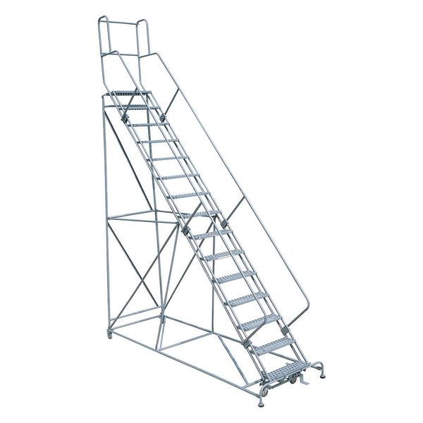 162 in H Steel Rolling Ladder, 12 StepsSKU G3489370Categories Material HandlingDescription Rolling Ladder, Material Steel, Platform Height 120 in, Handrails Included Yes, Handrail Height 42 in, Overall Height 162 in, Number of Steps 12, Unassembled, Load Capacity 450 lb, Step Tread Expanded Metal, Platform Depth 12 in, Platform Width 30 in, Bottom Width 34 in, Base Depth 186 in, Overall Width 32 in, Climbing Angle 50 Degrees , Step Depth 7 in, Step Width 30 in, Ladder Actuation Foot Activated Step Lock, Finish Powder Coated, Color Gray, Standards ANSI, OSHA, Rear Exit NograingerSKU: 21UZ81, mscSKU: , zoro_no: G3489370, mongo_id: 65bbe93c22d7a989a9941a1b