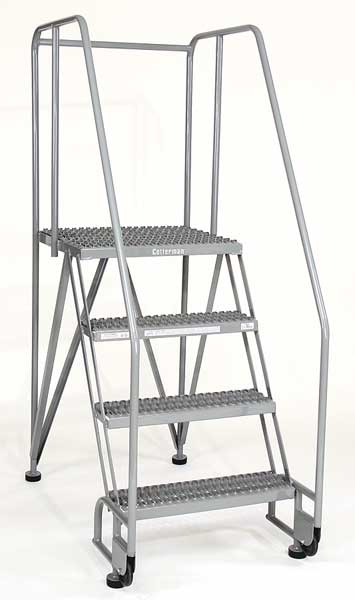 70 in H Steel Tilt and Roll Ladder, 4 StepsSKU G2137768Categories Material HandlingDescription Tilt and Roll Ladder, Material Steel, Platform Height 40 in, Handrails Included Yes, Handrail Height 30 in, Overall Height 70 in, Number of Steps 4, Assembled, Load Capacity 450 lb, Step Tread Expanded Metal, Platform Depth 10 in, Platform Width 24 in, Bottom Width 28 in, Base Depth 37 in, Overall Width 28 in, Climbing Angle 59 Degrees , Step Depth 7 in, Step Width 24 in, Ladder Actuation None, Finish Powder Coated, Color Gray, Standards ANSI, OSHA, Includes 2-1/2 in Rubber Pads, Rear Exit NograingerSKU: 4XM66, mscSKU: , zoro_no: G2137768, mongo_id: 65bbe93c22d7a989a99419f1