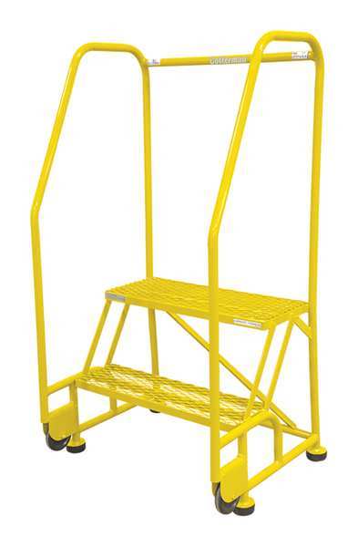 $416.24 / eachWeb price50 in H Steel Tilt and Roll Ladder, 2 StepsSKU G0999470Categories Material HandlingDescription Tilt and Roll Ladder, Material Steel, Platform Height 20 in, Handrails Included Yes, Handrail Height 30 in, Overall Height 50 in, Number of Steps 2, Assembled, Load Capacity 450 lb, Step Tread Serrated, Platform Depth 10 in, Platform Width 16 in, Bottom Width 20 in, Base Depth 24 in, Overall Width 20 in, Climbing Angle 59 Degrees , Step Depth 7 in, Step Width 16 in, Ladder Actuation None, Finish Powder Coated, Color Yellow, Standards ANSI, OSHA, Rear Exit NograingerSKU: 21VA48, mscSKU: , zoro_no: G0999470, mongo_id: 65bbe82a22d7a989a98dd55b