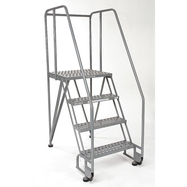 70 in H Steel Tilt and Roll Ladder, 4 StepsSKU G9817482Categories Material HandlingDescription Tilt and Roll Ladder, Material Steel, Platform Height 40 in, Handrails Included Yes, Handrail Height 30 in, Overall Height 70 in, Number of Steps 4, Assembled, Load Capacity 350 lb, Step Tread Expanded Metal, Platform Depth 20 in, Platform Width 24 in, Bottom Width 28 in, Base Depth 47 in, Overall Width 28 in, Climbing Angle 59 Degrees , Step Depth 7 in, Step Width 24 in, Ladder Actuation None, Finish Powder Coated, Color Gray, Standards ANSI, OSHA, Includes 2-1/2 in Rubber Pads, Rear Exit NograingerSKU: 3FME5, mscSKU: , zoro_no: G9817482, mongo_id: 65bbe91622d7a989a993343d