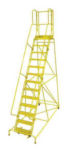 172 in H Steel Rolling Ladder, 13 StepsSKU G3490606Categories Material HandlingDescription Rolling Ladder, Material Steel, Platform Height 130 in, Handrails Included Yes, Handrail Height 42 in, Overall Height 172 in, Number of Steps 13, Unassembled, Load Capacity 450 lb, Step Tread Expanded Metal, Platform Depth 20 in, Platform Width 24 in, Bottom Width 42 in, Base Depth 186 in, Overall Width 44 in, Climbing Angle 59 Degrees , Step Depth 7 in, Step Width 24 in, Ladder Actuation Foot Activated Step Lock, Finish Powder Coated, Color Yellow, Standards ANSI, OSHA, Rear Exit NograingerSKU: 21UY57, mscSKU: , zoro_no: G3490606, mongo_id: 65bbe8ef22d7a989a9925045