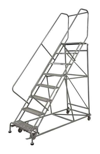 SKU G9862946Categories Material HandlingDescription Rolling Ladder, Material Steel, Platform Height 70 in, Handrails Included Yes, Handrail Height 30 in, Overall Height 100 in, Number of Steps 7, Assembled, Load Capacity 450 lb, Step Tread Serrated, Platform Depth 10 in, Platform Width 16 in, Bottom Width 24 in, Base Depth 53 in, Overall Width 24 in, Climbing Angle 59 Degrees , Step Depth 7 in, Step Width 16 in, Ladder Actuation Foot Activated Step Lock, Finish Powder Coated, Color Gray, Standards ANSI, OSHA, Includes Crutch Tips, Rear Exit NograingerSKU: 5FYY5, mscSKU: , zoro_no: G9862946, mongo_id: 65bbe8ef22d7a989a9925044