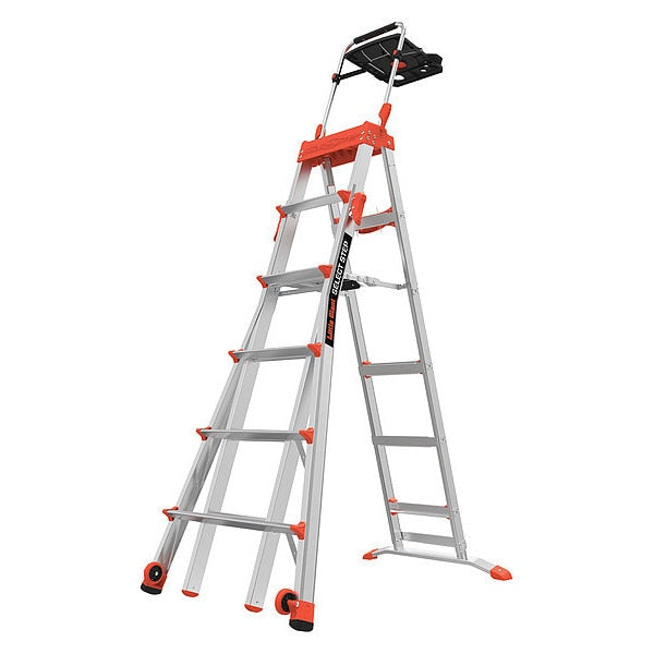 Adjustable Stepladder, Aluminum, 300 lb Load CapacitySKU G4995672Categories Material HandlingDescription Stepladder, Material Aluminum, ANSI Type IA, Ladder Height 6 to 10 ft, Load Capacity 300 lb, Number of Steps 4 to 7, Base Spread 48 in, Bottom Width 32 1/2 in, Step Depth 1 3/4 in, Step Tread Ribbed, Series Select Step, Includes AirDeck(TM) Tool Tray, Instruction Manual, Wheels, Standards OSHA and ANSI 14.2, Rung/Step Spacing 12 ingraingerSKU: 40P129, mscSKU: , zoro_no: G4995672, mongo_id: 65bbe8ef22d7a989a9925070