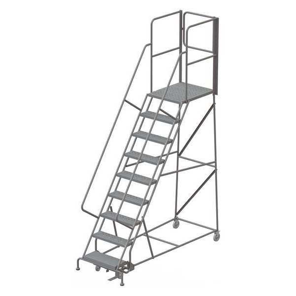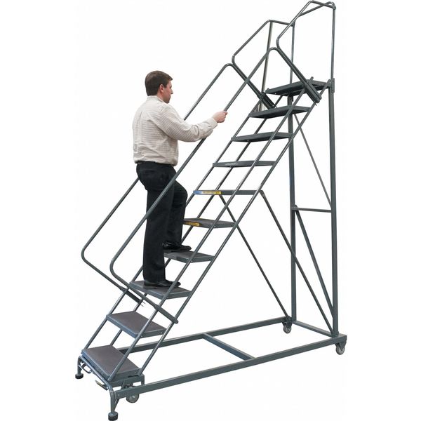 133 in H Steel Rolling Ladder, 10 StepsSKU G9851396Categories Material HandlingDescription Rolling Ladder, Material Steel, Platform Height 100 in, Handrails Included Yes, Handrail Height 30 in, Overall Height 133 in, Number of Steps 10, Assembled, Load Capacity 450 lb, Step Tread Abrasive Mat, Platform Depth 14 in, Platform Width 24 in, Bottom Width 32 in, Base Depth 74 in, Overall Width 32 in, Climbing Angle 59 Degrees , Step Depth 7 in, Step Width 24 in, Ladder Actuation Foot Activated Step Lock, Finish Powder Coated, Color Gray, Standards ANSI, OSHAgraingerSKU: 8AX41, mscSKU: , zoro_no: G9851396, mongo_id: 65bbe8ef22d7a989a9925017